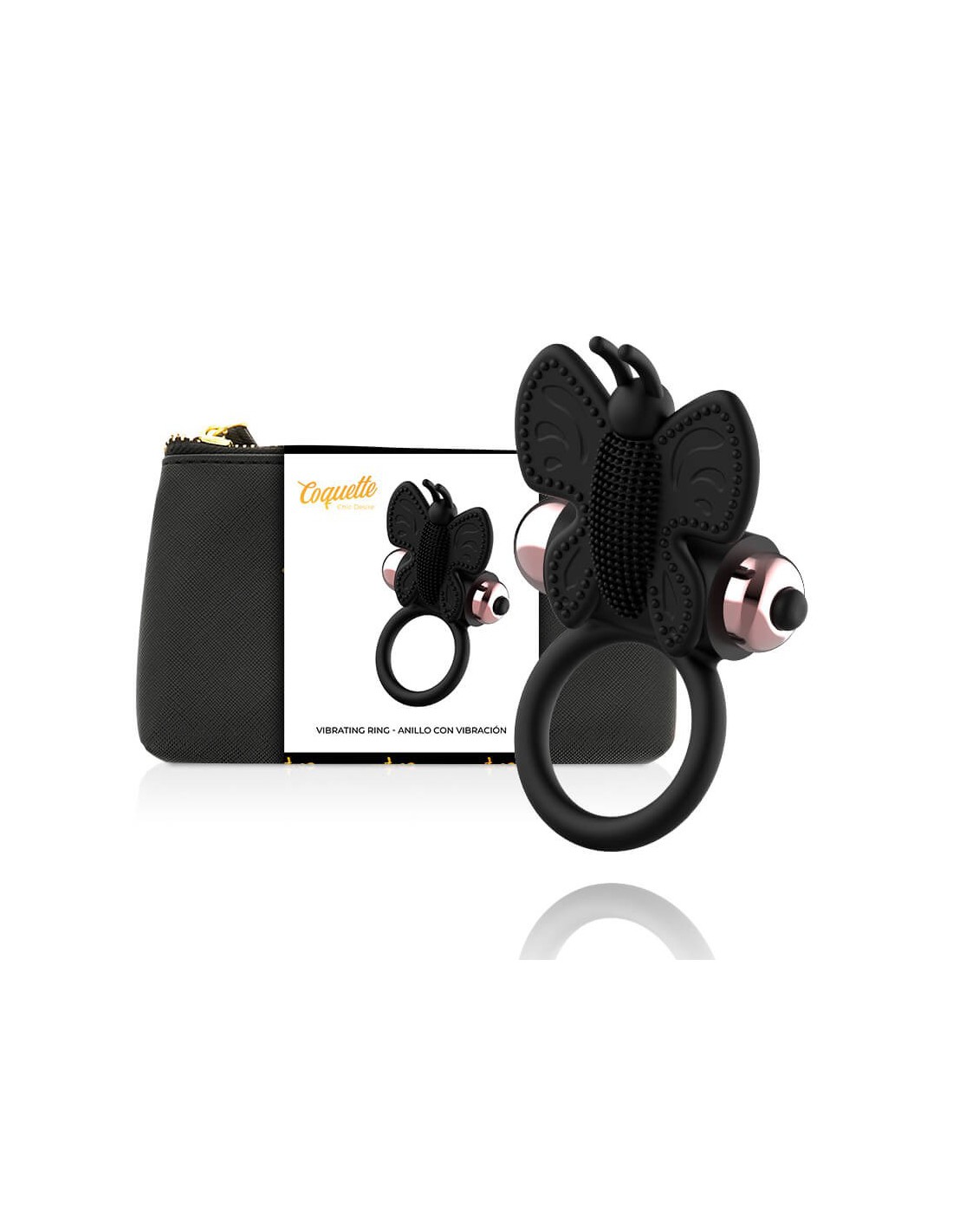¡Disfruta de placer compartido con el anillo vibrador Butterfly Coquette! Este anillo, con una mariposa estimuladora de clítoris, está hecho de silicona suave y resistente. Sus vibraciones potentes están diseñadas para potenciar la erección y retrasar la eyaculación, mejorando el rendimiento sexual para ambos. Es sumergible y viene en un elegante estuche para que puedas llevarlo a cualquier lugar. Incluye pilas LR44 y tiene un modo de vibración para que experimentes nuevas sensaciones.