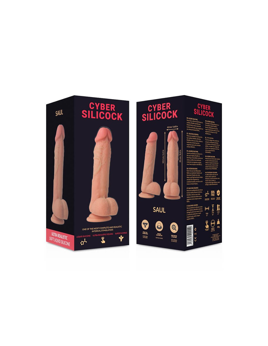 El dildo Saul de 21 cm, fabricado en silicona líquida, simula con precisión un pene real. Su diseño recto, con un glande detallado y base de testículos, brinda una experiencia placentera tanto vaginal como anal. La ventosa ancha permite fijarlo en superficies lisas, siendo ideal para usar en la ducha o el baño. La silicona médica es suave y alcanza rápidamente el calor corporal para una sensación más realista. Para mantenerlo en buen estado, usa lubricante a base de agua y limpia con un limpiador antibacteriano después de cada uso.