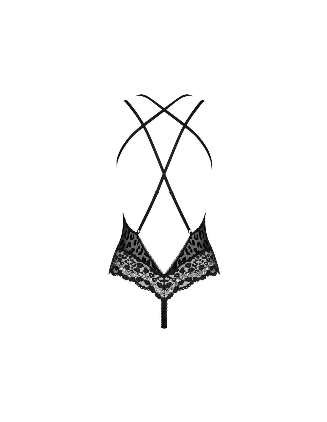 La elegancia, la sensualidad y lo salvaje están unidos en el body de encaje negro Giully. Un elegante body de corte clásico y con un bonito patrón de terciopelo. Con correas ajustables que se entrelazan en la parte posterior garantizando el mejor ajuste. Una espalda que queda mucho más sensual y atrevida. Este body se abrocha en la entrepierna.