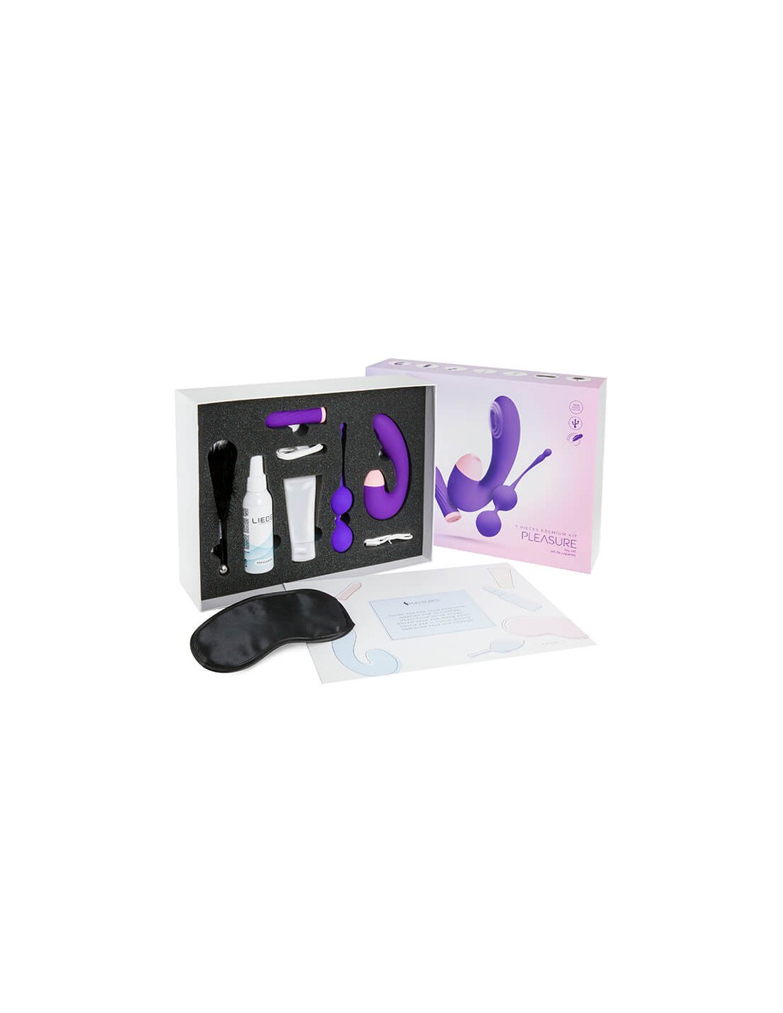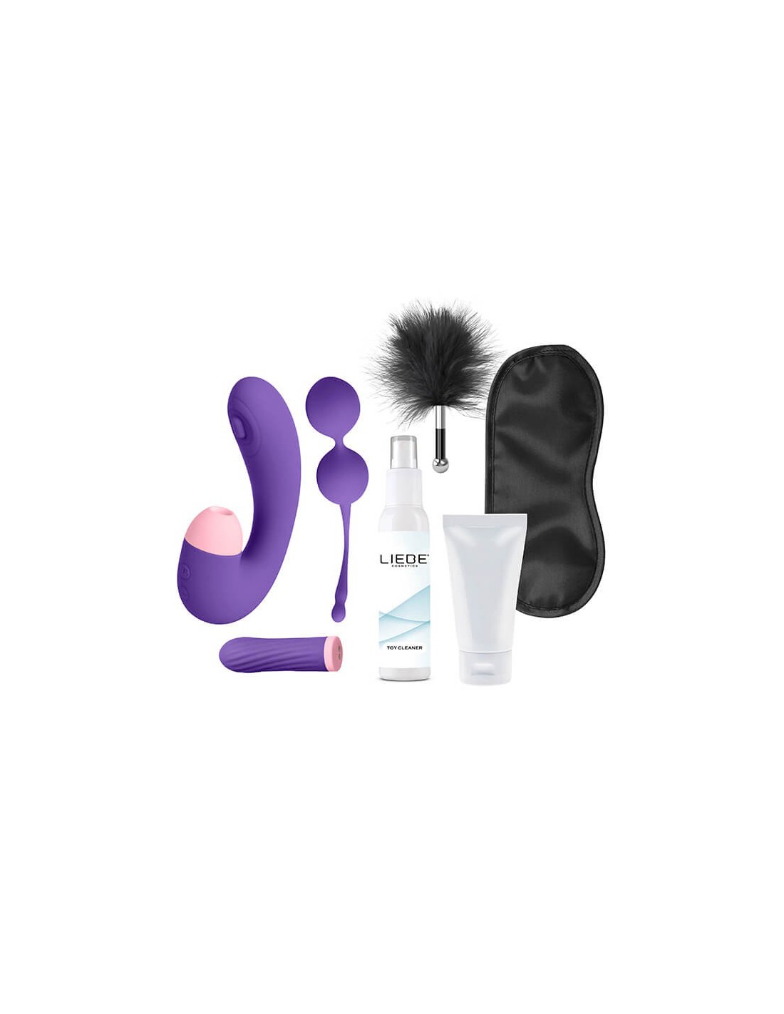 - Incluye: una bala vibradora para zonas erógenas, un estimulador doble para punto G y clítoris, unas bolas Kegel para fortalecer el suelo pélvico, un lubricante a base de agua, un limpiador de juguetes, una plumita y un antifaz.